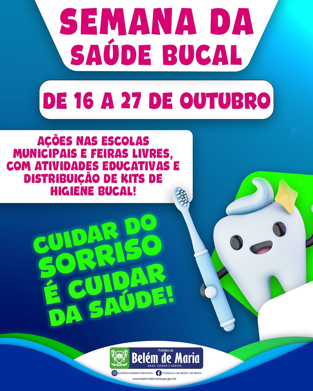 A Prefeitura Municipal de Belém de Maria, através da Secretaria de Saúde, estará realizando a Semana da Saúde Bucal, de 16 a 27 de outubro!