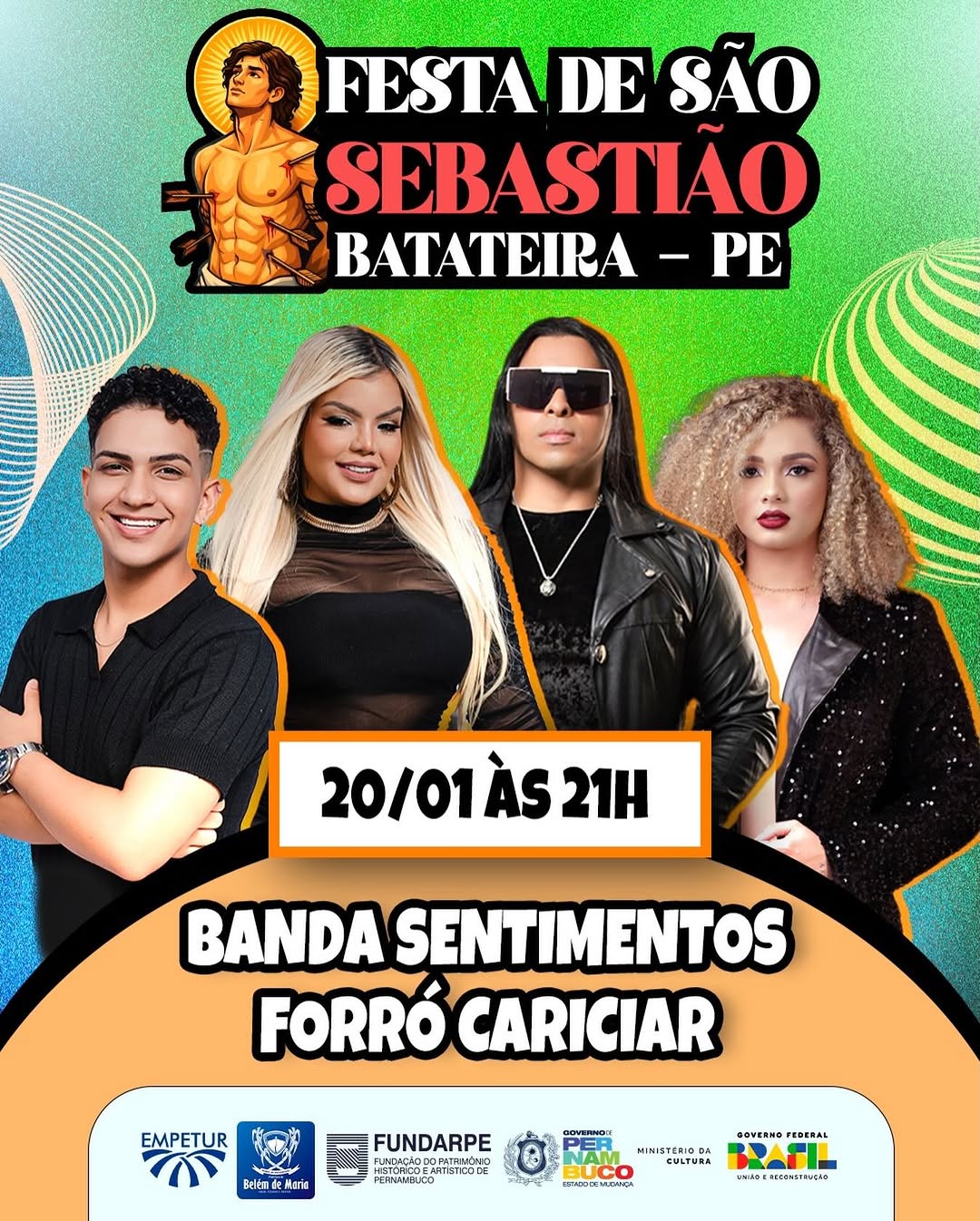 A Festa de São Sebastião acontece dia 20/01, a partir das 21h, e a gente se encontra pra curtir essa noite especial ao som da Banda Sentimentos e do forró Cariciar.