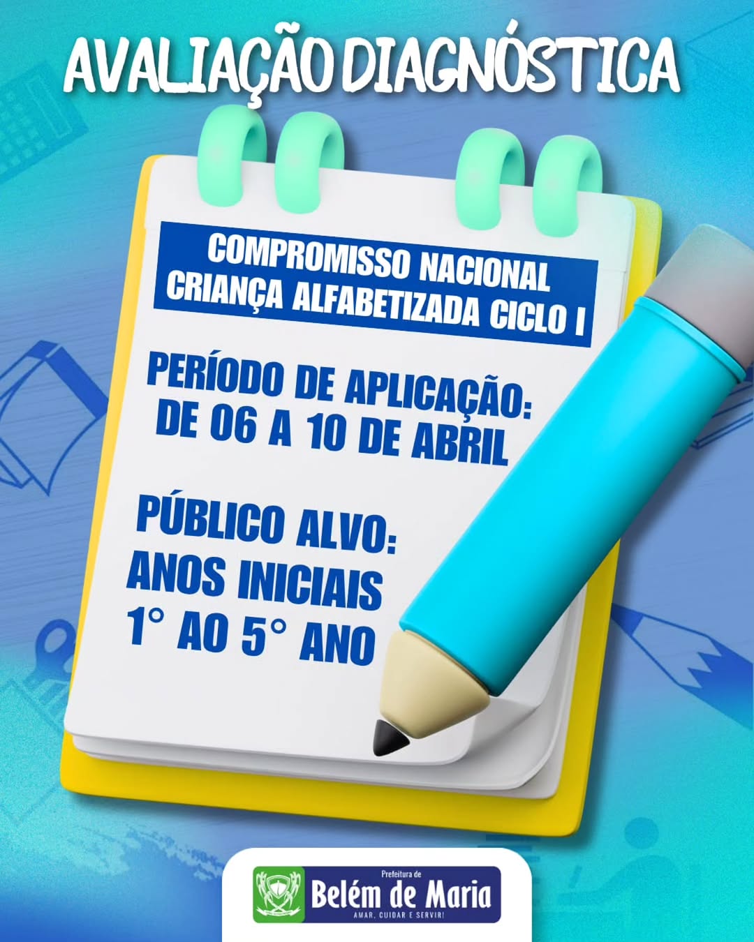 De 06 a 10 de abril, acontece a Avaliação Diagnóstica para os alunos do 1º ao 5º ano. Vamos juntos acompanhar o desenvolvimento das nossas crianças!