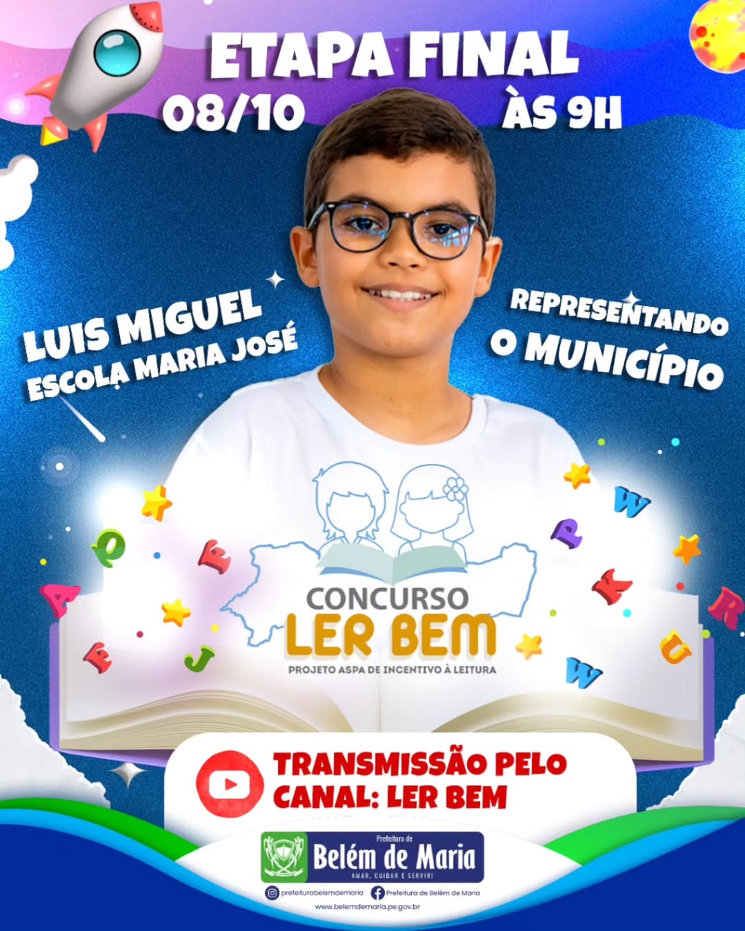 Com muita alegria, celebramos a participação de Luis Miguel, aluno da Escola Maria José, que estará representando Belém de Maria na etapa final do Concurso Ler Bem!
