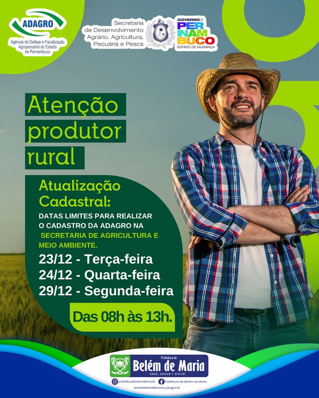 A Prefeitura Municipal, através da Secretaria de Agricultura e Meio Ambiente informa: as datas limites para o cadastro obrigatório da Adagro são: