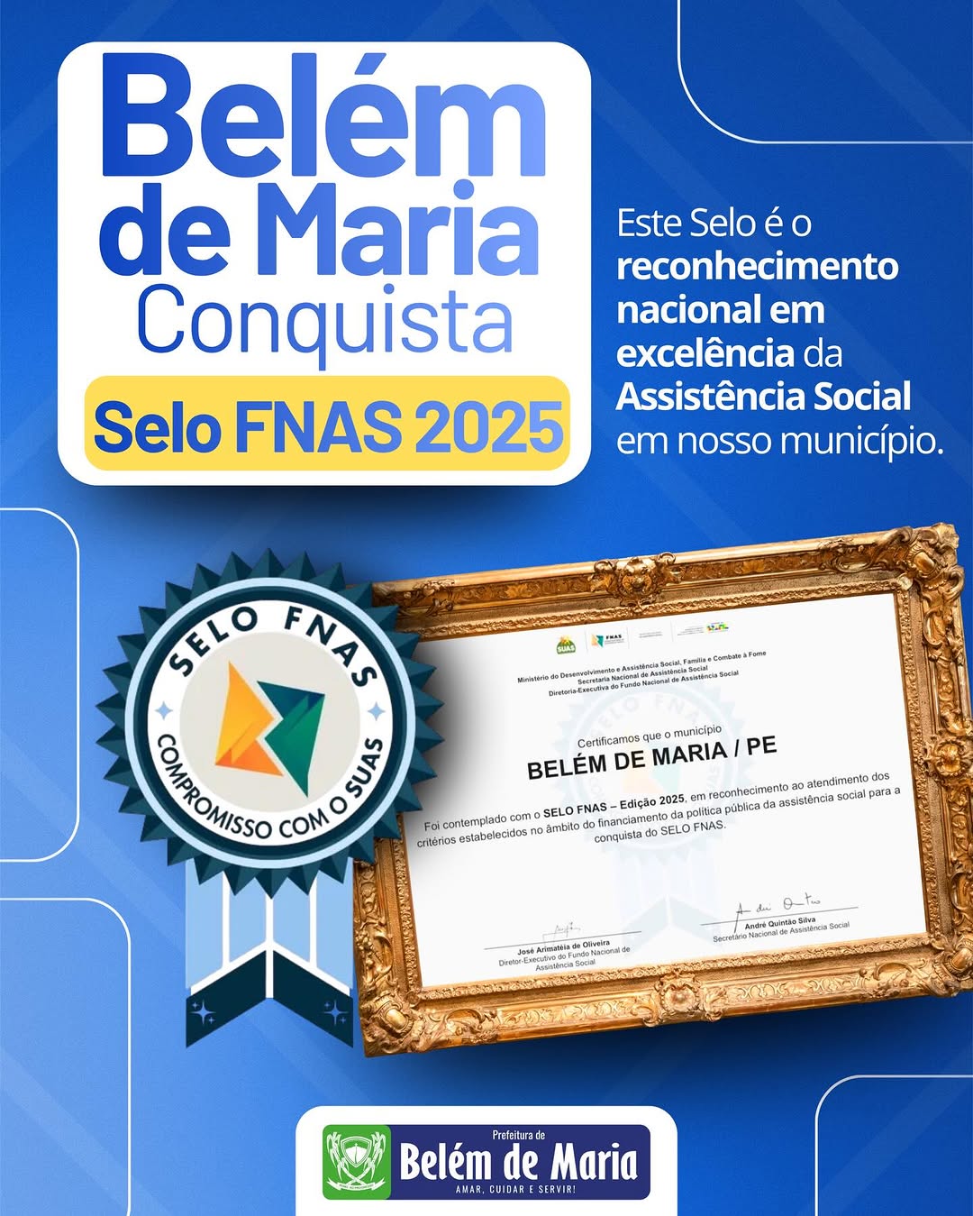 A Prefeitura Municipal, por meio da Secretaria de Desenvolvimento Social e Direitos Humanos, conquistou o Selo FNAS – Edição 2025, um importante reconhecimento pelo cumprimento dos critérios no financiamento da política de assistência social.