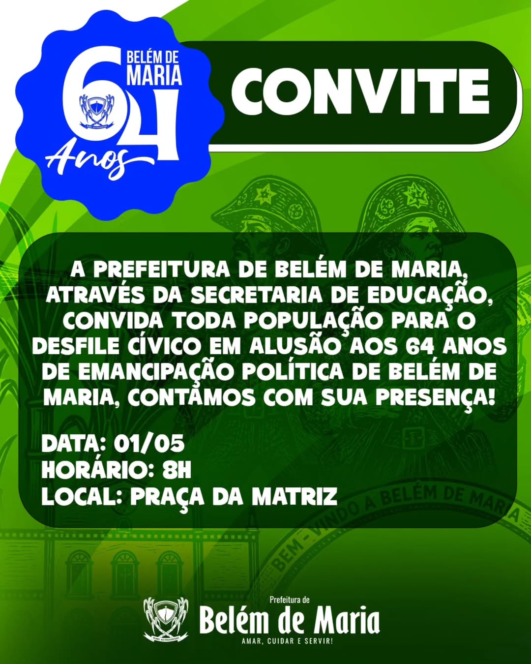 Vamos juntos celebrar os 64 anos de emancipação política de Belém de Maria com um lindo desfile cívico, marcado por história, cultura e orgulho da nossa terra.